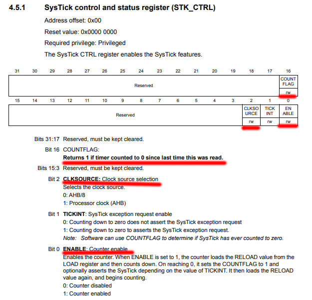 bit 1은 SysTick의 counter를 감소시키다가 0이 되면 exception request를 발생시킨다. 즉 zero가 되었을 때 간섭(interrupt)을 발생시키기 위해서는 이 등록부(Register)를 1로 설정해야 한다. 간섭(interrupt)이 발생했을 때 bit 16을 읽으면 count 가 zero임을 알수 있다.