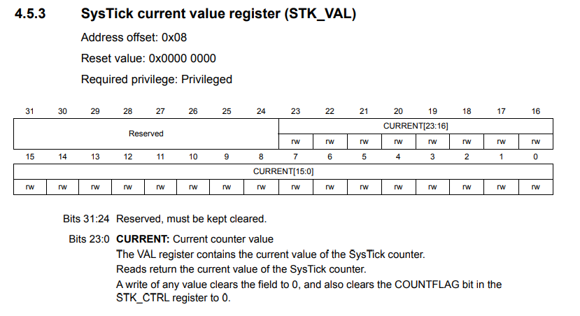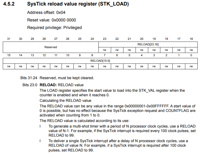 RELOAD 값은 0x00000001-0x00FFFFFF 범위의 모든 값일 수 있습니다. 0이라는 시작 값도 가능하지만, 1에서 0까지 셀때(count)할 때 SysTick 예외요청(exception request)과 COUNTFLAG가 활성화되기 때문에 효과가 없습니다. RELOAD 값은 용도에 따라 계산됩니다.