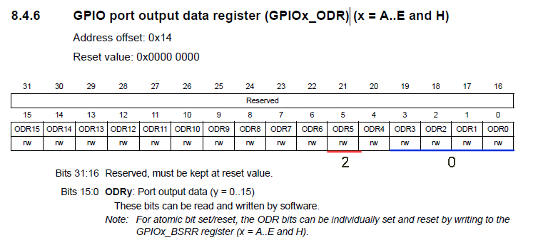 [7] (*GPIOA).ODR ^= 0x20; // Toggle LED
