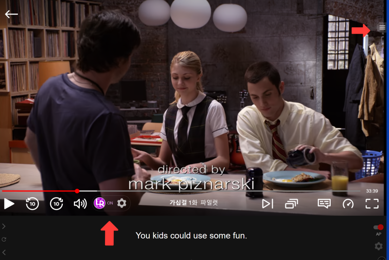 language reactor 는 아래의 화면처럼 아래에서 on/off 할 수 있습니다.